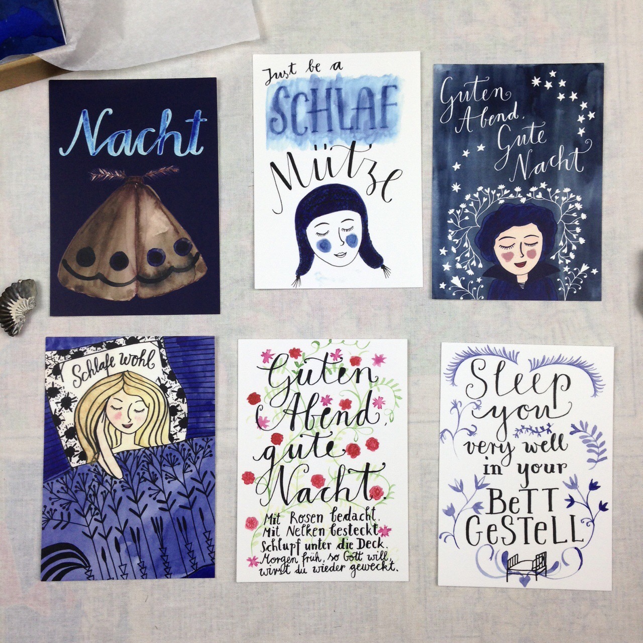 10 Postkarten für besseren Schlaf sind wieder da. Es gibt sie jetzt in meinem Set guten Abend gute Nacht zusammen mit dem Sternenhimmel und einem Poster.