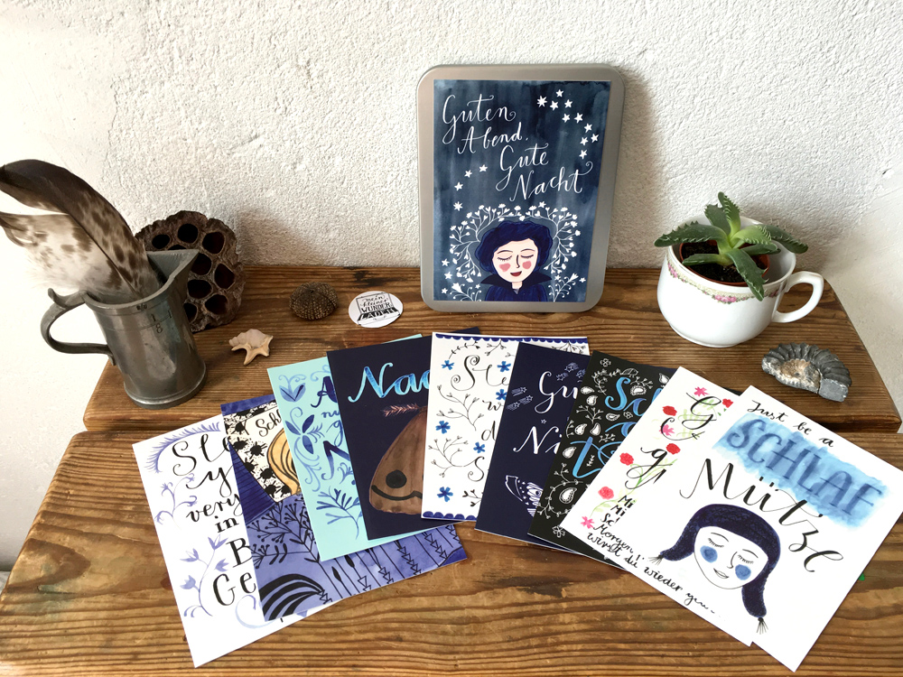 10 Postkarten mit Einschlaf-Wünschen in einer Blechdose, mit schön gestaltetem Etikett. Die Postkarten kannst du einzeln oder als Set nutzen. Bekannte Sprüche wie „schlaf gut, träume süß“ oder „Guts Nächtle“ wünschen dir eine gute Nacht und einen erholsamen Schlaf. Jede Karte wurde individuell von mir illustriert oder aquarelliert und enthält Handlettering, denn ich wünsche mir, dass du gut schlafen kannst. Der Druck ist sehr hochwertig, die Karten sind fest und liegen außerdem gut in der Hand oder auf dem Kopfkissen.