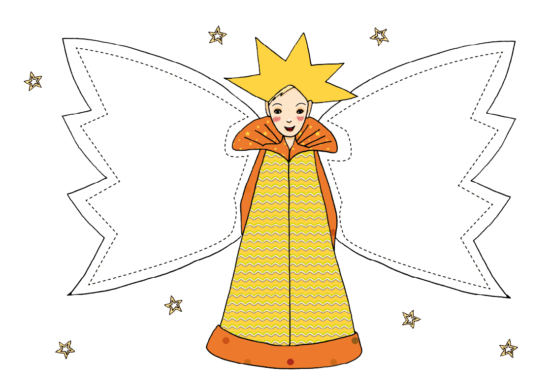 Du druckst die Engel auf festem Papier aus. Dann schneidest du die Figur aus. Mit einer kleinen Schere schneidest du das innere der Flügel heraus. Lege die Engel dann auf ein Stück farbiges Transparentpapier (alternativ: Backpapier, Butterbrotpapier) und zeichne die Umrisse der Flügel darauf. Schneide nun mit ausreichend Abstand das Transparentpapier aus und klebe es von hinten an die Flügel. Jetzt kannst du die Engel ins Fenster hängen