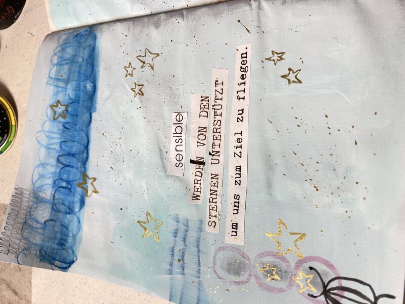 Wenn du mit Textelementen arbeitest, die du aus Zeitschriften oder Buchseiten ausschneidest, wirst du das schnell merken. Du wählst intuitiv Worte aus, die dich berühren oder deine Sicht der Welt ausdrücken. Das ist meistens ziemlich verblüffend. Ich finde es jedes Mal spannend, wie es passiert, dass meine Kursteilnehmerinnen so schöne poetische Texte kombinieren und wie sehr diese zu ihnen passen.
